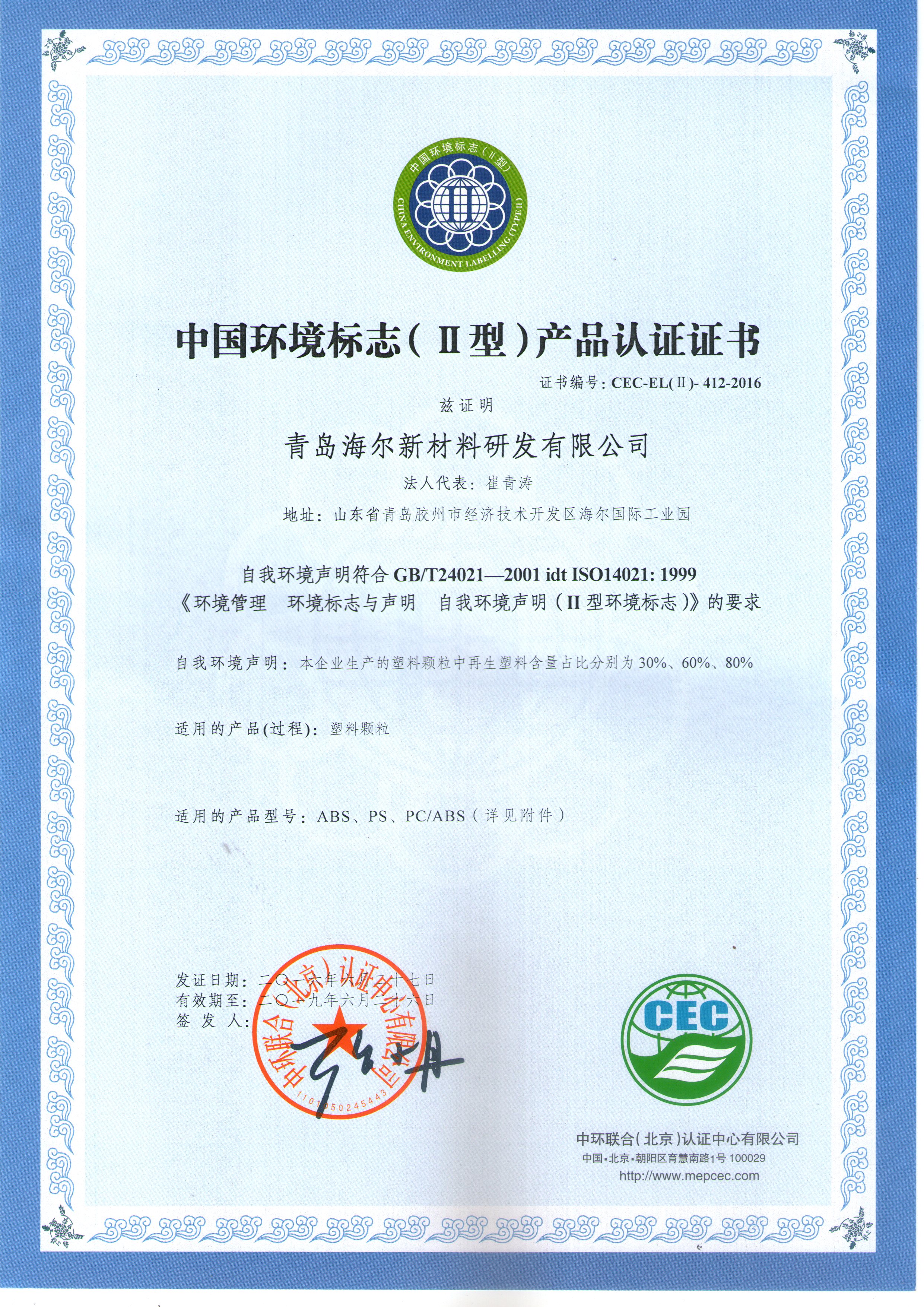 中国环境标志二型海尔证书样本